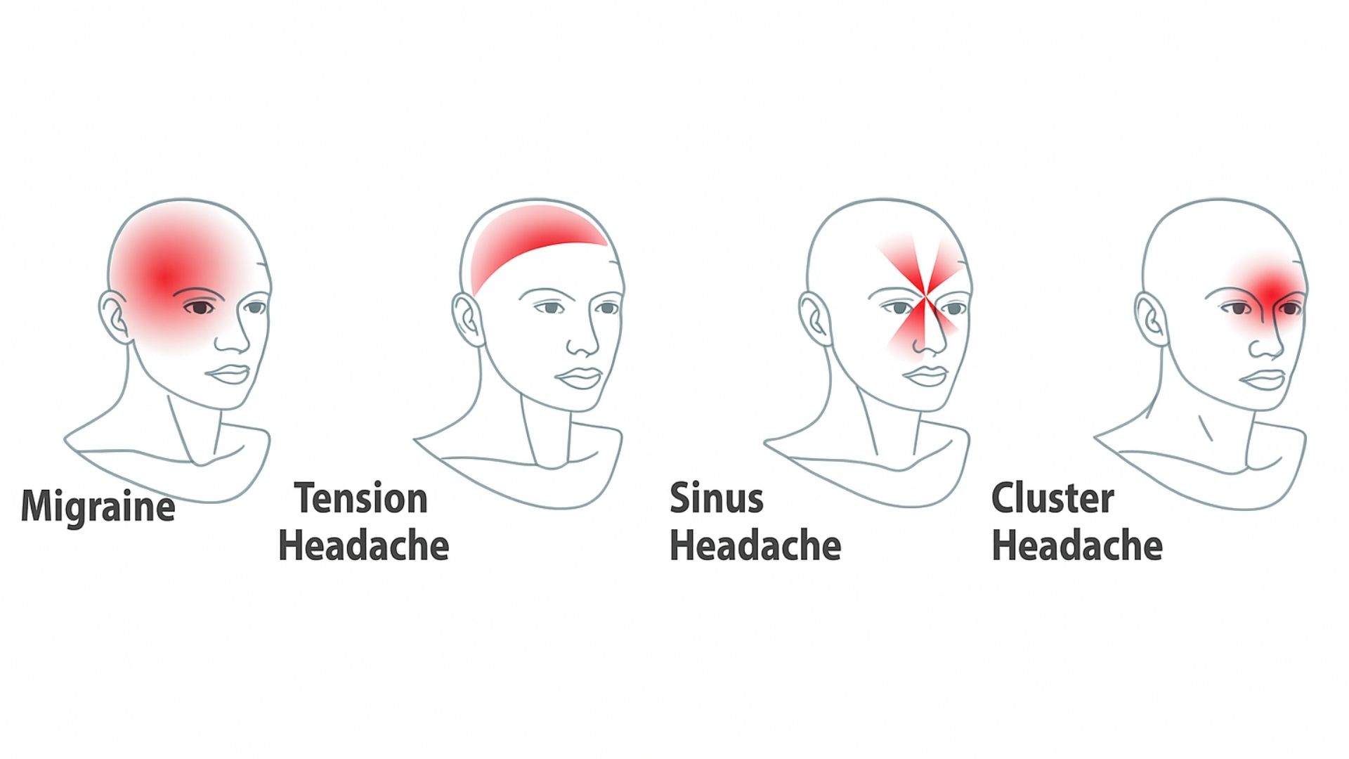 This visual guide highlights the specific areas affected by migraine, tension, sinus, and cluster headaches—helping you identify and understand your symptoms better.